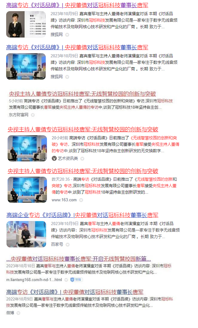 摘要 : 近日,冠標科技董事長唐軍唐總受邀做客中央廣播電視總臺著名主持人董倩高端訪談《對話品牌》,內容涵蓋智慧教育、文旅的行業(yè)走向,引發(fā)媒體高度關注,搜狐網、今日頭條….相繼跟進報道,這次訪談都會行業(yè)廠商、教育文旅業(yè)主方了解行業(yè)動態(tài)、推動行業(yè)進步,必將發(fā)揮示范引領作用,對于智慧教育、智慧文旅的發(fā)展也將會起到重要的推動作用!