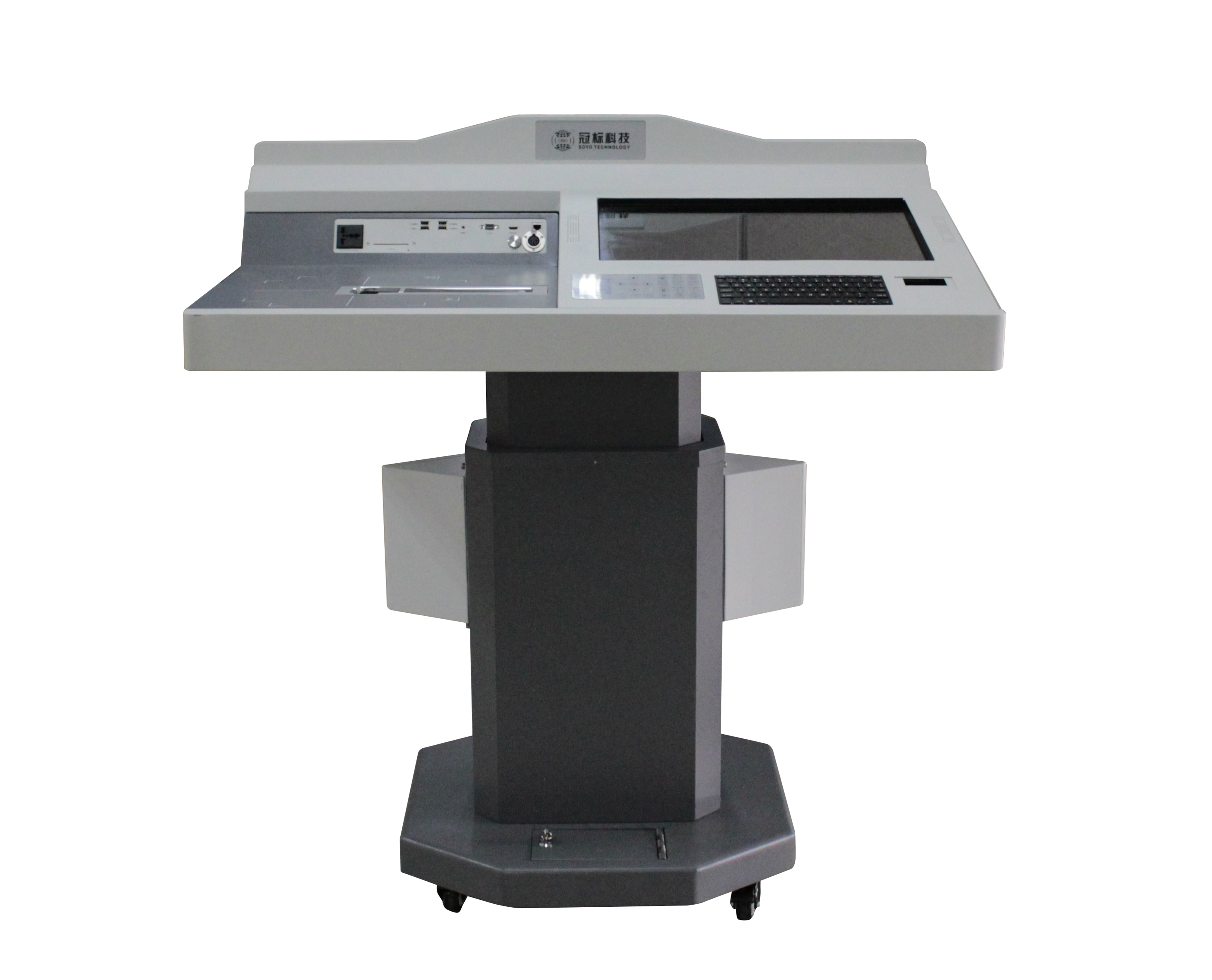 一體機(jī)可靈活移動,臺面高度可在0.825米到1.125米之間自由調(diào)節(jié)(電動升降、智能控制),臺面可承受大于200Kg重量